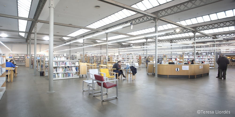 La primera fase de la rehabilitació de la fàbrica la van dur a terme els arquitectes Antoni Poch i Jordi Moliner entre els anys 1989 i 1992 i va consistir en l’adequació de vuit naus per convertir-les en la Biblioteca Central de Badalona. En aquesta fase es va construir un nou volum – unit a les naus originàries mitjançant un porxo cobert – per acollir els serveis, les instal·lacions i la recepció, deixant les antigues naus lliures per allotjar les sales de consulta. La intervenció va ser mereixedora del Premi FAD 1991 en l’apartat de Reformes i rehabilitacions.