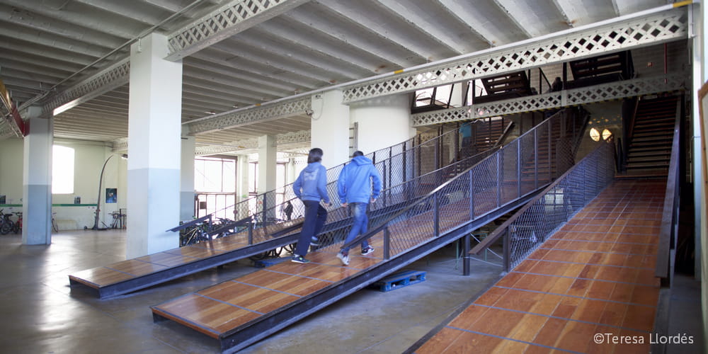 La planta baixa de l’edifici es converteix en un porxo exterior gràcies a la nova porta d’entrada. A l’interior, el recorregut principal està format per unes rampes-escala: les rampes s’aturen on l’alçada de la visió coincideix amb les bigues de gelosia originals i, d’aquesta forma, el visitant pot observar un pla calat. A partir d’aquí, se segueix pujant mitjançant unes escales. S’han eliminat parts del forjat per tal de donar més alçada en determinats punts de l’edifici com, per exemple, a la primera planta on s’aconsegueix un balcó sobre l’entrada. Com que la normativa no permetia fer noves obertures a la façana per facilitar l’entrada de llum natural, a la primera planta es van posar uns tancaments interiors de vidre fragmentat que permeten relacionar els diferents àmbits i recollir la llum existent. A la segona planta, se substitueix una part de la coberta de teula per una coberta de vidre transparent.